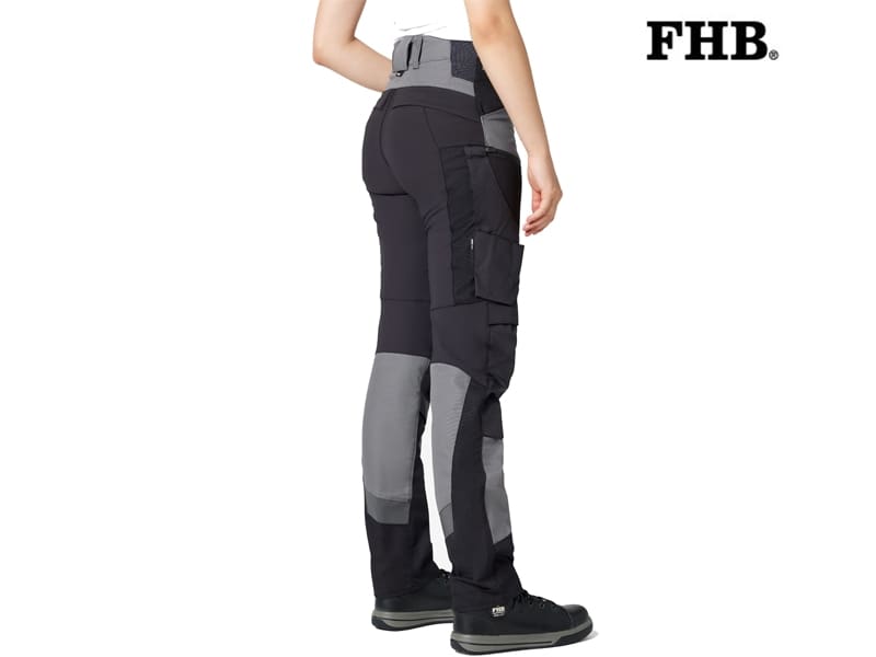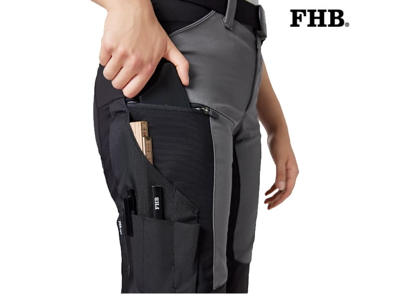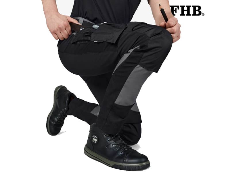 Het ontwerp van de broek is zowel functioneel als stijlvol, met robuuste stretch bij de heupen, het kruis en de knieën, een aansluitende pasvorm, stretch 3D-Frinlock inzetstukken voor een comfortabele pasvorm, 100% polyamide (Cordura) bij de knieën en zakken (potlood, mes en vouwmeter). De kniebeschermers kunnen er van bovenaf worden ingebracht. Er is een zak voor een mobiele telefoon met rits, een uitbreidbare volumezak met verwijderbare magnetische knoop, 2 ruime achterzakken en speciale riemlussen waar de FHB holsterzakken aan kunnen worden bevestigd.