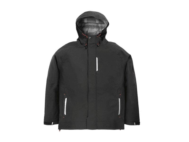 hoogwaardige stof FHB houdt u droog. Waterdicht (10.000 mm waterkolom), winddicht en ademend (. 5.000 g / m² / 24 uur), verzegelde naden, super functioneel en super licht, verborgen ritsen, twee zakken aan de voorkant en een mobiele telefoon zak op de mouw, 1 binnenzak, reflectiestrepen in het voorste en achterste gedeelte van de jas