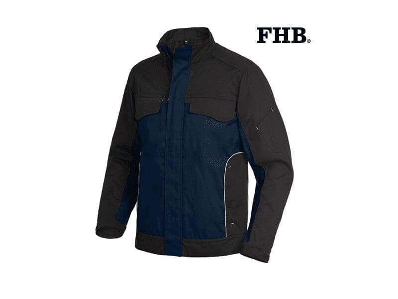 2 klepzakken op de borst 2 grote zijzakken met rits 2 binnenzakken witte contrastbies als zakhoekversterking verborgen ritssluiting voor reflecterende paspels zoom- en mouwwijdte verstelbaar.