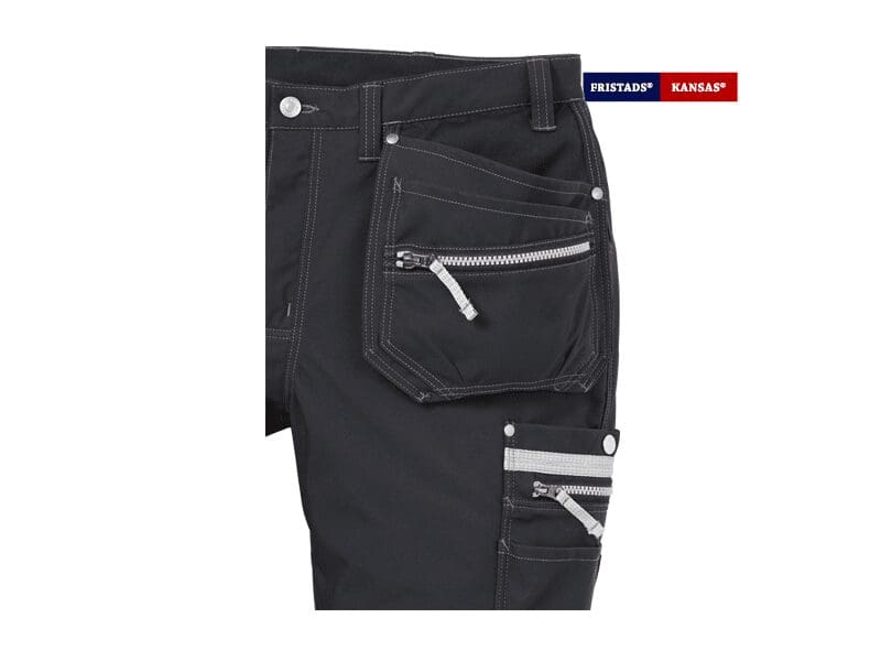 - 2 voorzakken, 1 met telefoonzakje / 2 met CORDURA® verstevigde schuine achterzakken