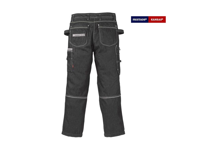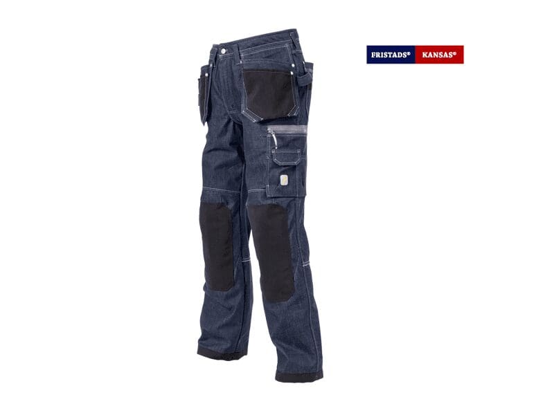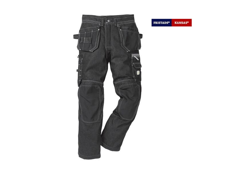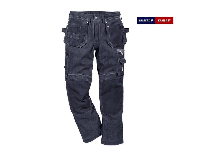 - 2 hamerlussen/zak voor duimstok op de zijnaad, verstevigd met CORDURA® – met losse onderkanten, knoop en lus voor timmermansmes en pennenzakje