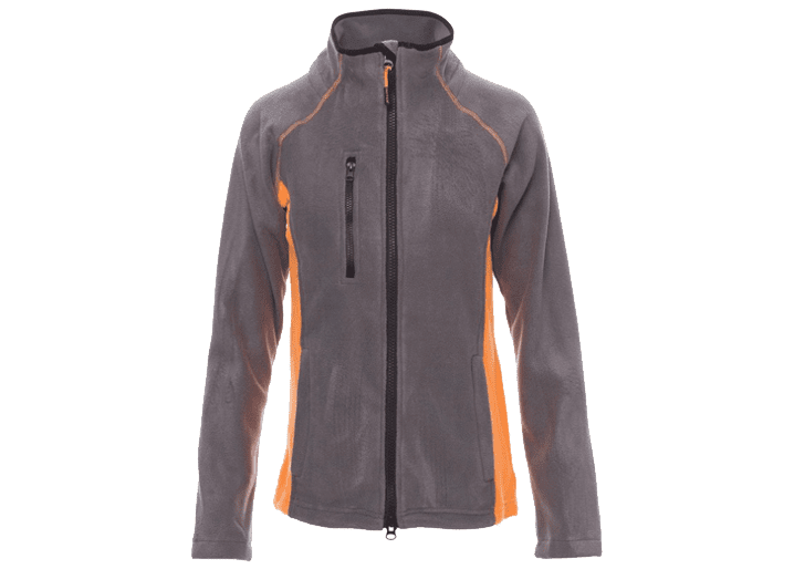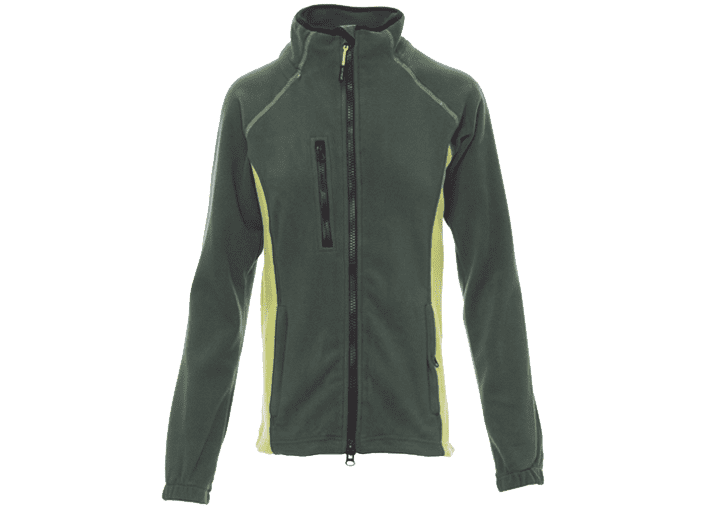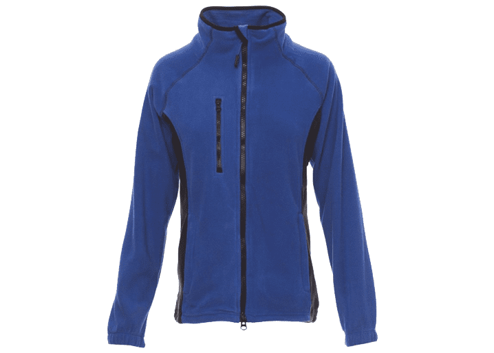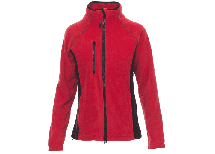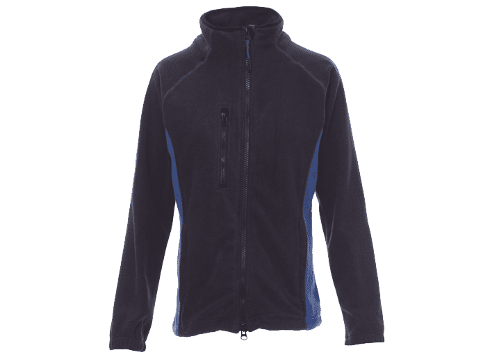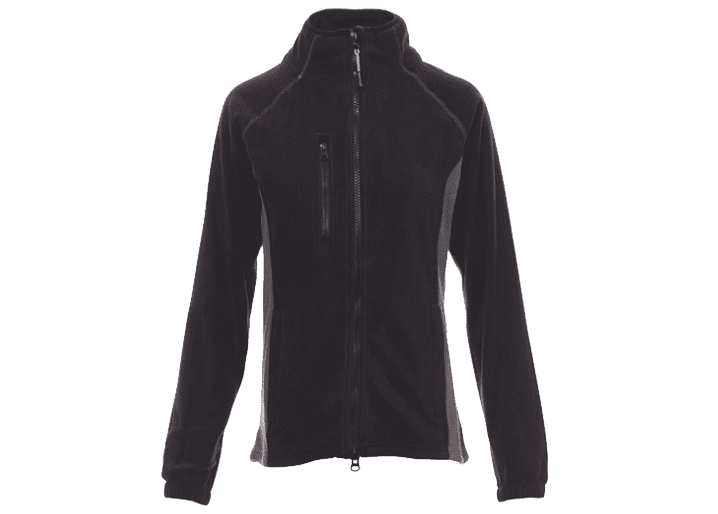 Nauwsluitend damesfleecevest in twee kleuren, met rits van 8 mm van zwart kunststof, raglanmouwen, verstelbaar trekkoord in de taille, elastische manchetten, twee zakken met verdekte rits, een zak met rits voor, nek met contrasterende versterkingsband, versterkte naden.