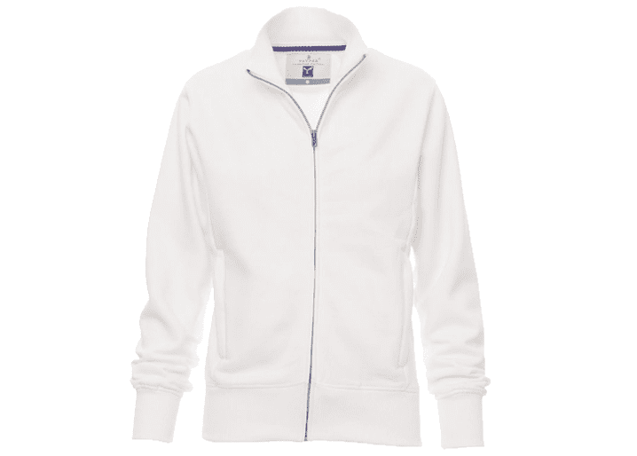 Nauwsluitend damessweatshirt, doorlopende metalen SBS-rits, enkele runner, geribd aan de zijkanten, twee zakken met rits, ribboorden met stretch aan de zoom en mouwen en binnenkraag, versterkte naden.