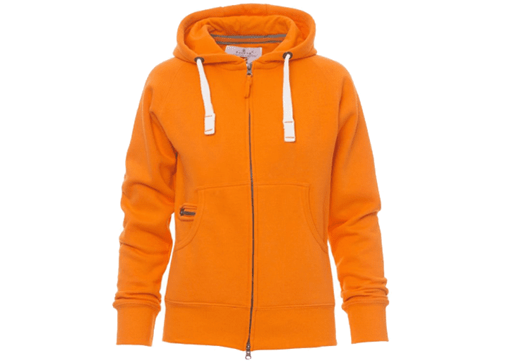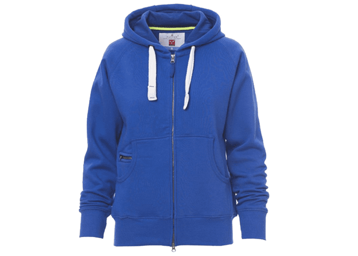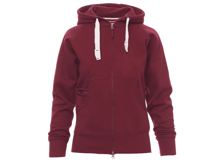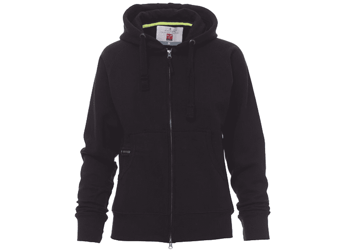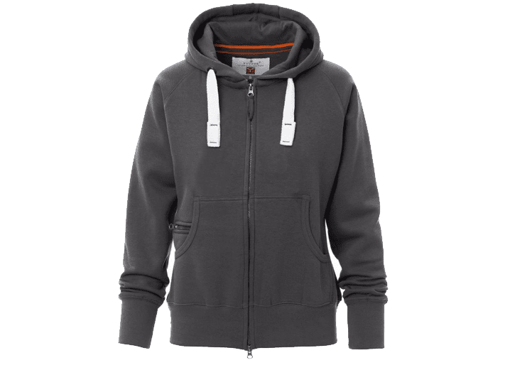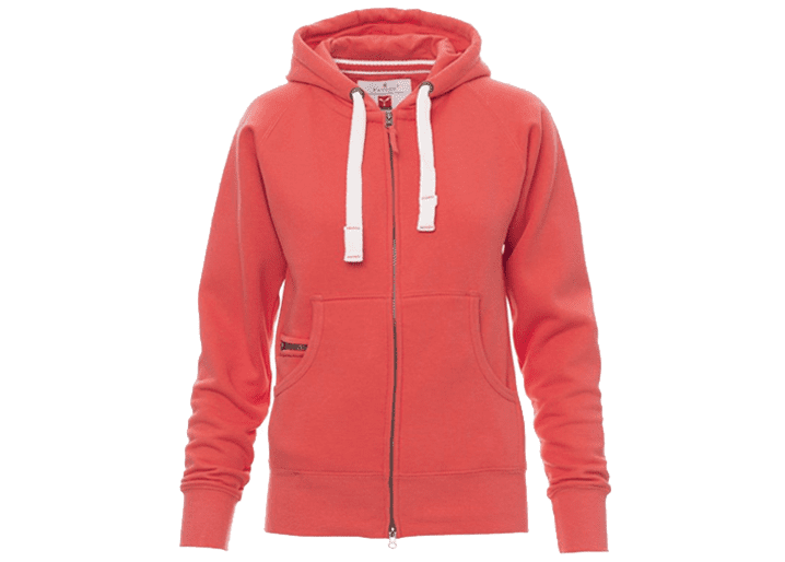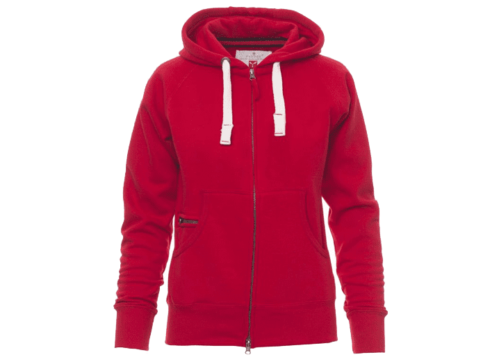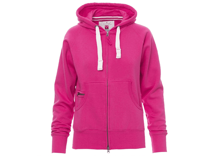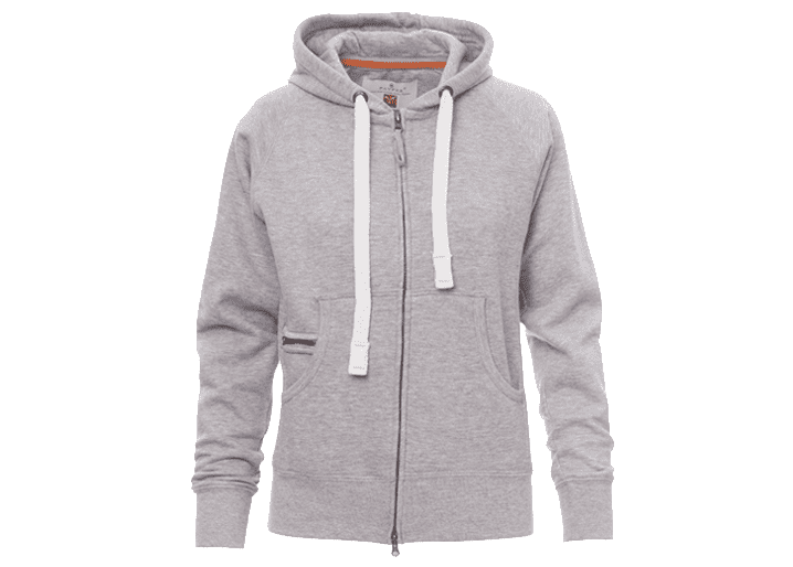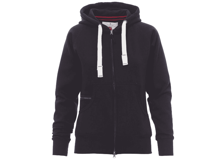 Nauwsluitende dameshoodie met doorlopende geplastificeerde SBS-rits met dubbele metalen runner, capuchon met dubbel gestikte naden en wit trekkoord met contrasterend stiksel en metalen ringen, raglanmouwen, kangoeroezakken, kleine zak met rits, ribboorden met stretch aan de zoom en mouwen, versterkte naden.