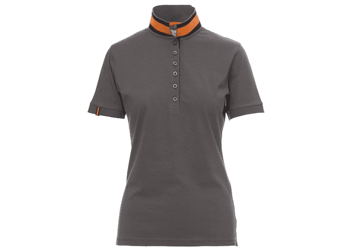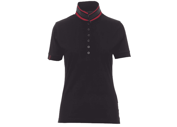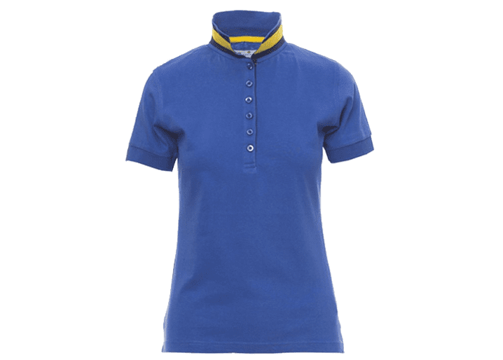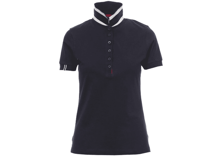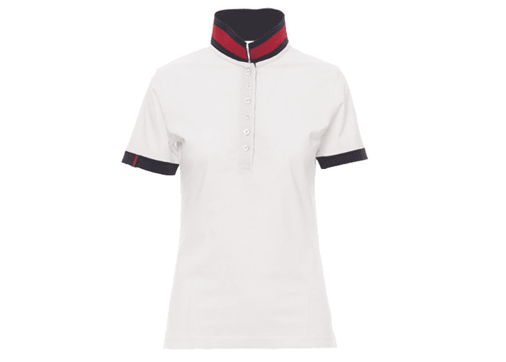 Nauwsluitend damespoloshirt met korte mouwen met 6 bijpassende knopen met parelmoereffect, bijpassende kraag met contrasterende onderkant, contrasterende achterkant van overslag en zijsplitten, rechte mouwrand in kleur (dezelfde kleur als de kraag), geribde mouwrand, verborgen stiksels bij de kraag met contrasterende band, versterkingsband aan de zijkant, band aan de binnenzijde van de nek.
