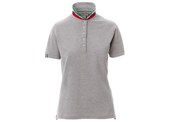 Nauwsluitend damespoloshirt met korte mouwen met 5 bijpassende knopen met parelmoereffect, bijpassende kraag met contrasterende onderkant (kleuren van de vlag), rechte mouwrand in kleur (dezelfde kleur als de kraag), geribde kraag- en mouwrand, rand van zijsplitten in kleuren van de vlag, verborgen stiksels bij de kraag met jersey band (kleuren van de vlag), versterkingsband aan de zijkant, band aan de binnenkant van de nek.