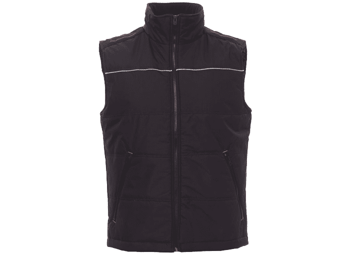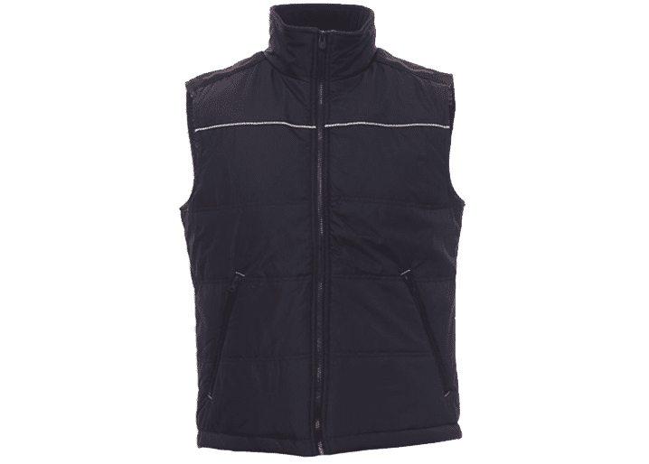 Unisex bodywarmer met kunststof rits van 5 mm met metalen runner, gevormde rug, twee ruime buitenzakken met rits, reflecterende pipingband op de borst en rug. Binnenzijde: doorgestikte gewatteerde voering, afgewerkt met voering met hoge dichtheid, binnenkraag van fleece, een binnenzak.