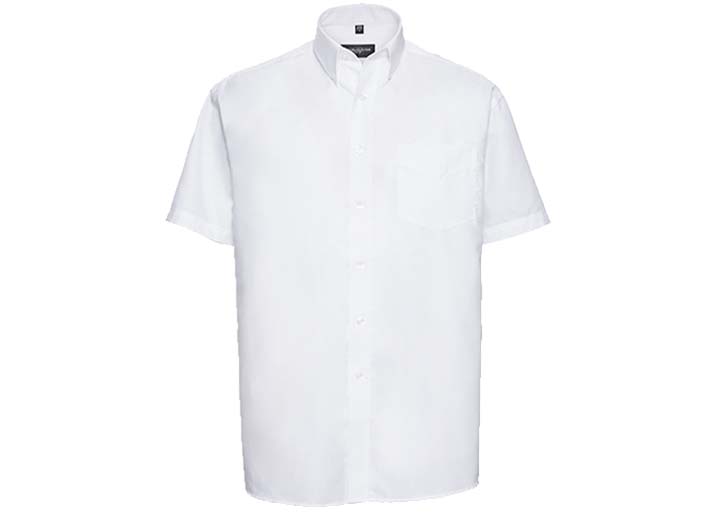 Shirt SSL. 70% katoen-30% polyester, oxford. Gewicht: Wit 130 g/m², Kleur 135 g/m².Easy Care. Button down kraag. Schouderstuk met 2 evenwijdige plooien aan achterzijde. Borstzak links. Ronde zoom.