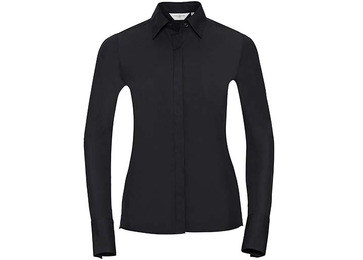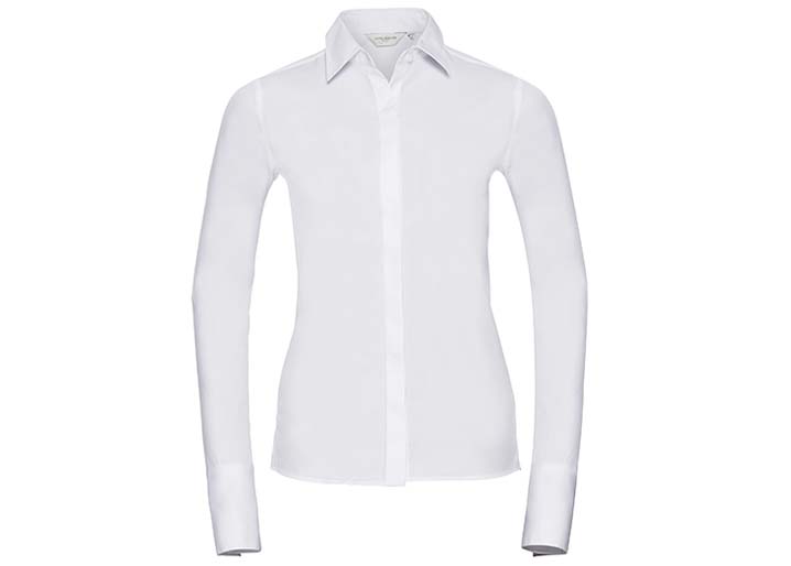 Shirt LSL. 75% katoen-25% Lycra® (T400® fibre). Gewicht: wit 125 g/m², zwart 130 g/m². Stretch. Uitstekende vormvastheid, duurzame stof, vochtregulerend, dit houdt de drager droog en koel. Moderne kraag. Verborgen knoopsluiting. Princess panel seams, geen zijnaden. Cocktail manchetten. Ronde zoom.