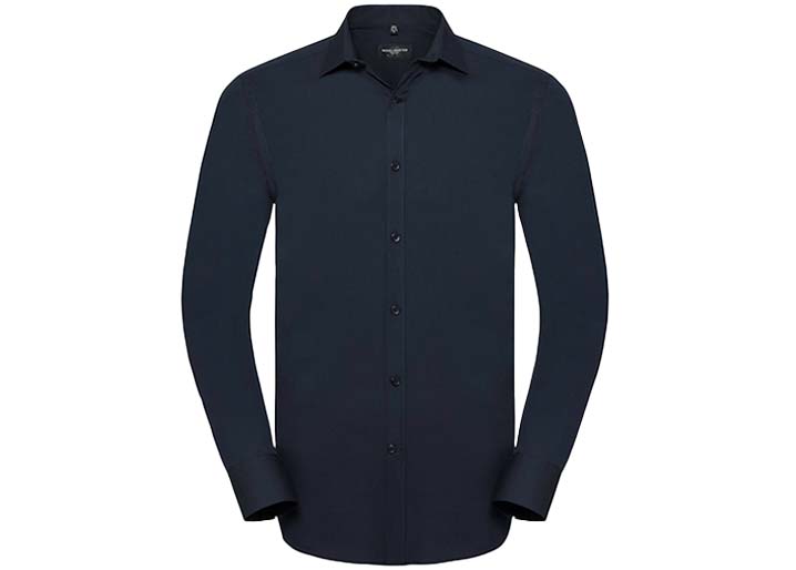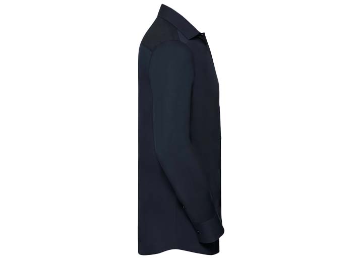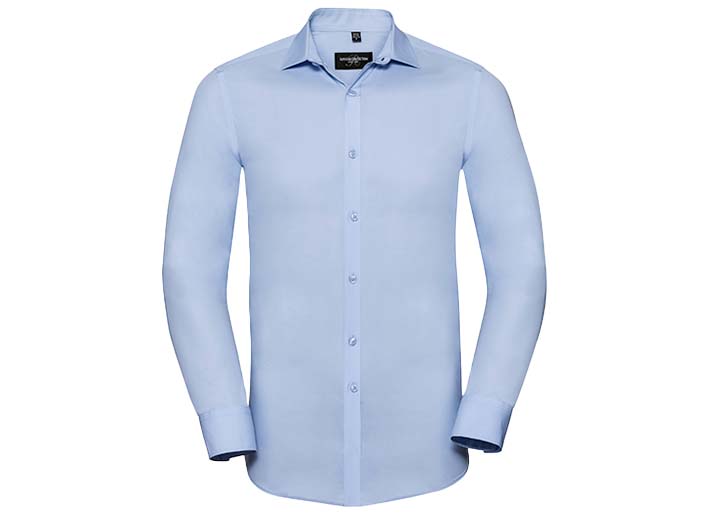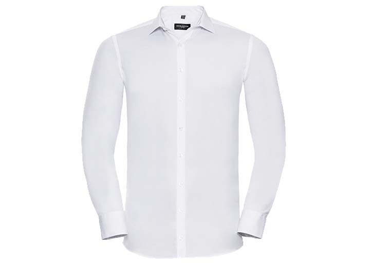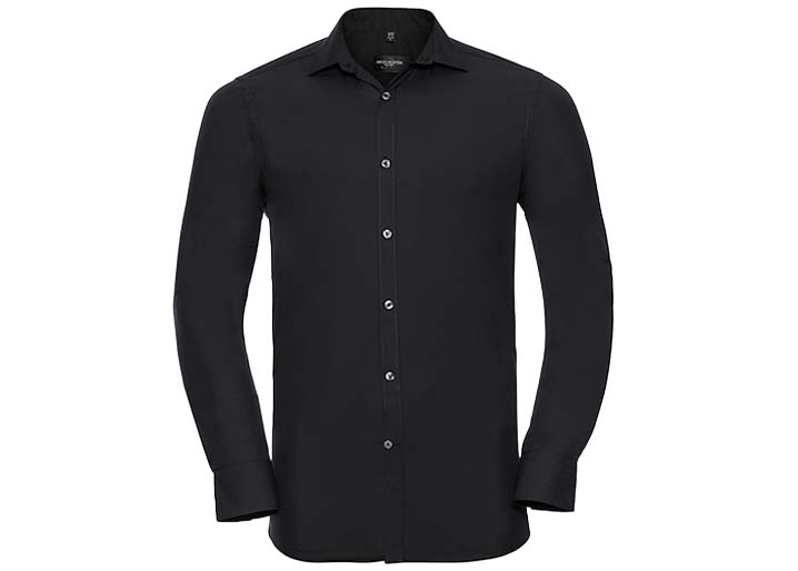 Shirt LSL. 75% katoen-25% Lycra® (T400® fibre). Gewicht: wit 125 g/m², zwart 130 g/m². Stretch. Uitstekende vormvastheid, duurzame stof, vochtregulerend, dit houdt de drager droog en koel. Uitgesneden kraag. Smalle knoopsluiting. Verstelbare manchetten 2 knopen,optie manchetknopen. Ronde zoom.