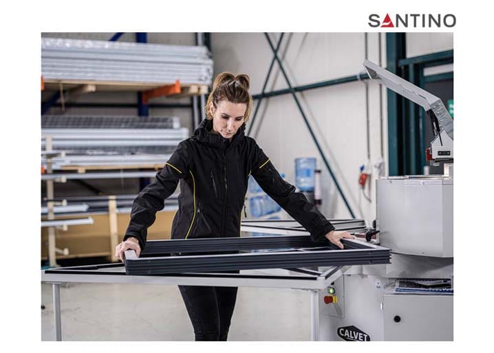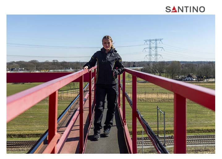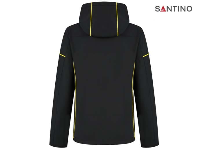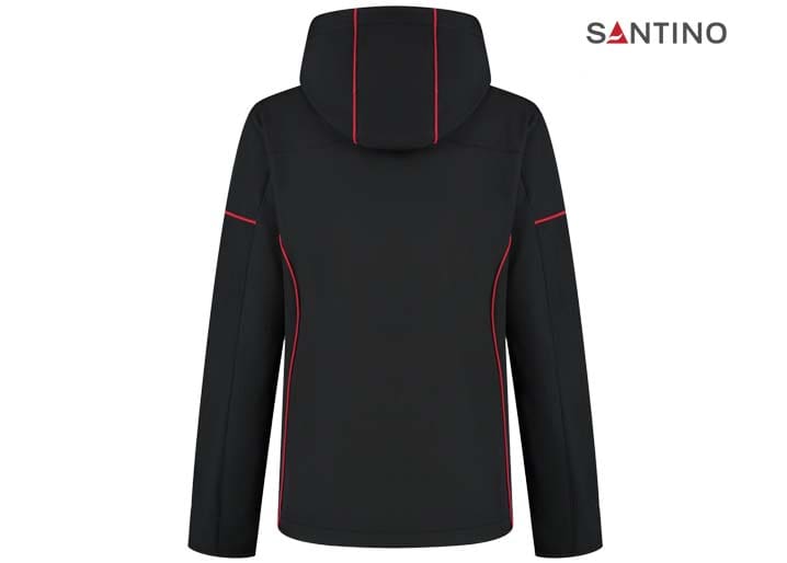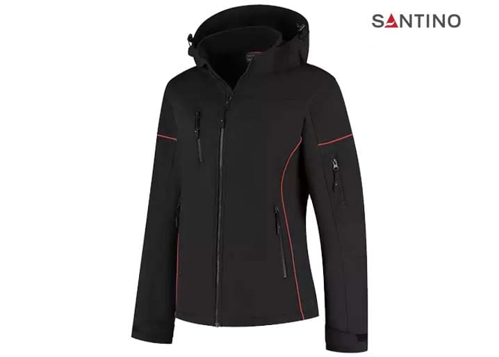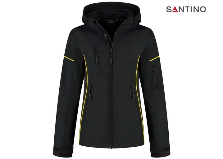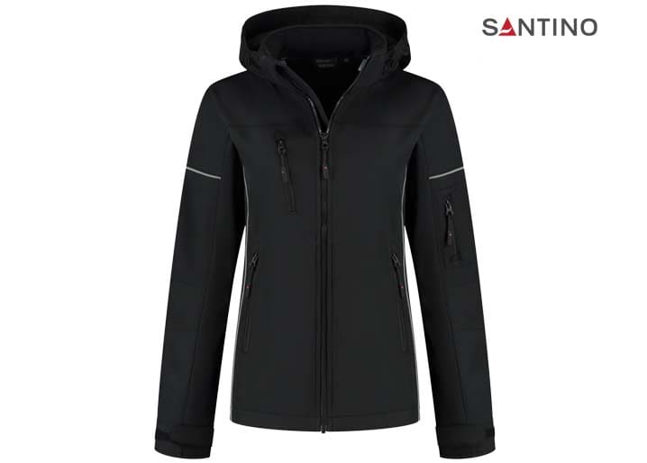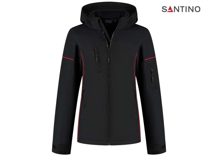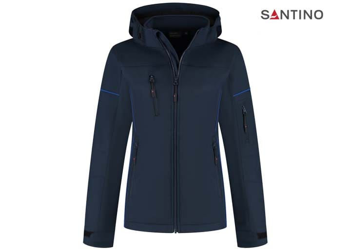 Softshell jacket, 94% gerecycled polyester / 6% elastaan, GRS gecertificeerd , 310 gr/m², 3-laags softshell met microfleece als binnenlaag, ladies fit, contrast piping, opstaande kraag en afritsbare capuchon, voorsluiting met windvanger, YKK rits, 2 steekzakken, borstzak, mouwzak met YKK rits, mouw met gladde voering, verstelbare manchetten met windvanger, onderzijde verstelbaar middels koord en stopper. 3D Santino logo transfer op onderzijde. Winddicht, waterafstotend waterkolom 3000 mm, ademend 3000 gr/m2 / 24h.