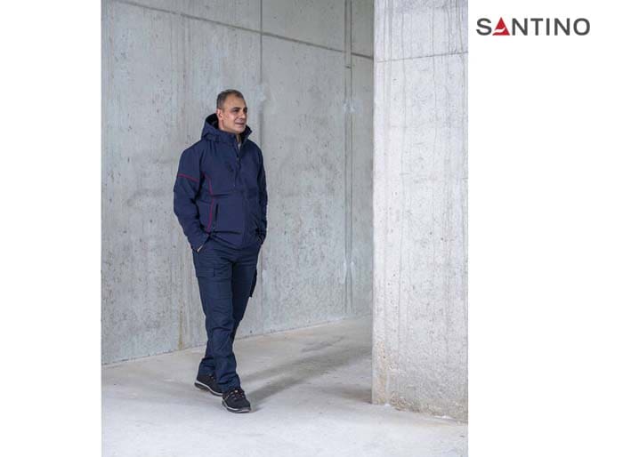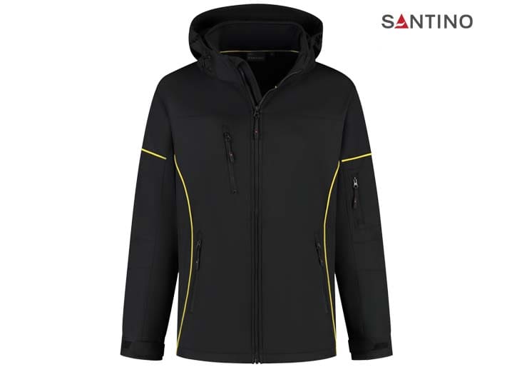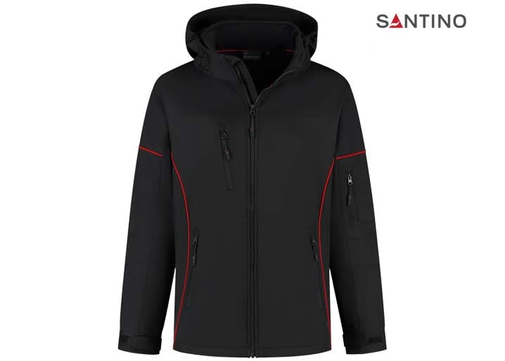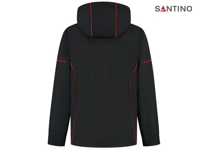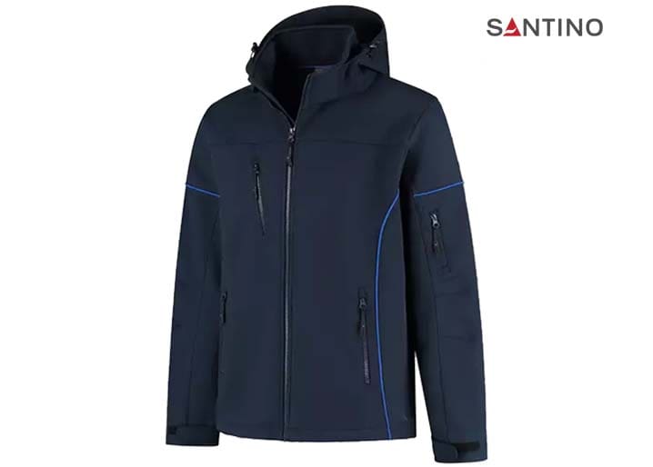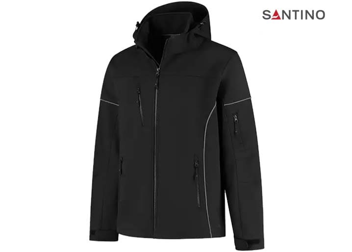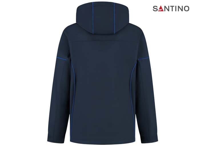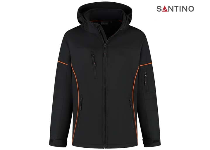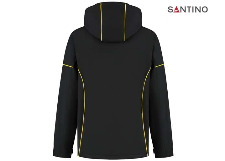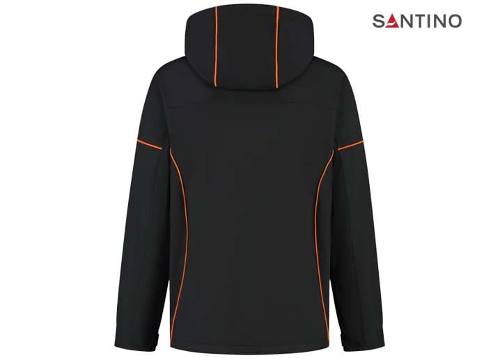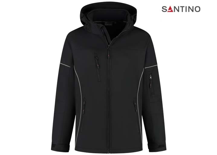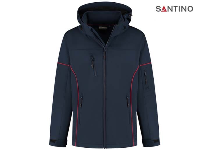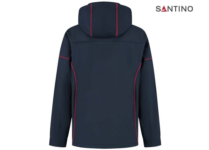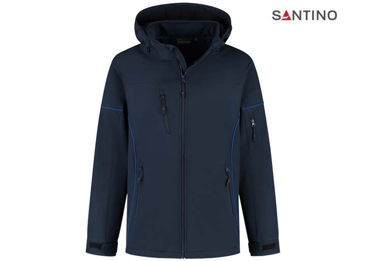 Softshell jacket, 94% gerecycled polyester / 6% elastaan, GRS gecertificeerd , 310 gr/m², 3-laags softshell met microfleece als binnenlaag, unisex, regular fit, contrast piping, opstaande kraag en afritsbare capuchon, voorsluiting met windvanger, YKK rits, 2 steekzakken, borstzak, mouwzak met YKK rits, mouw met gladde voering, verstelbare manchetten met windvanger, onderzijde verstelbaar middels koord en stopper. 3D Santino logo transfer op onderzijde. Winddicht, waterafstotend 3000 mm, ademend, waterkolom 3000 gr/m2 / 24h.