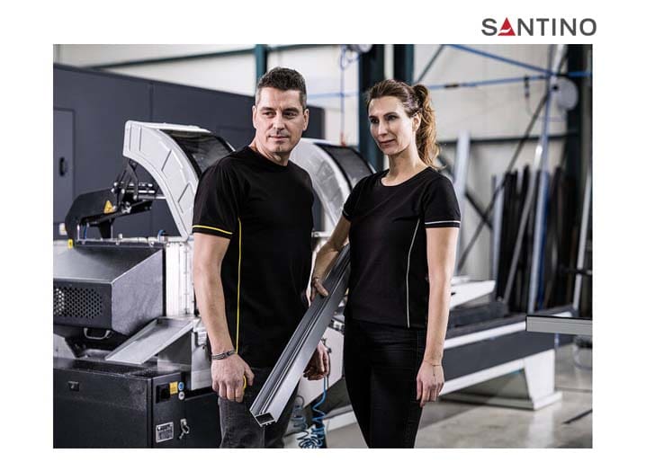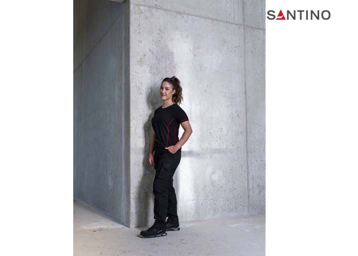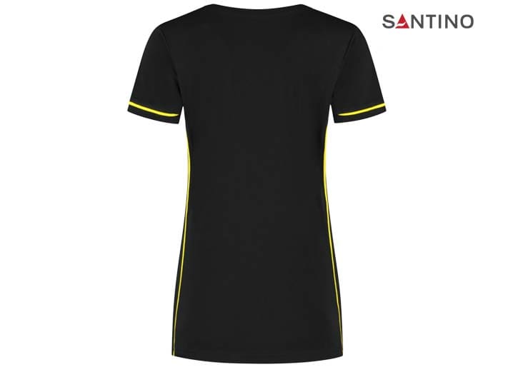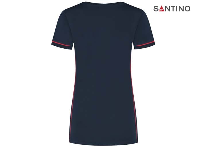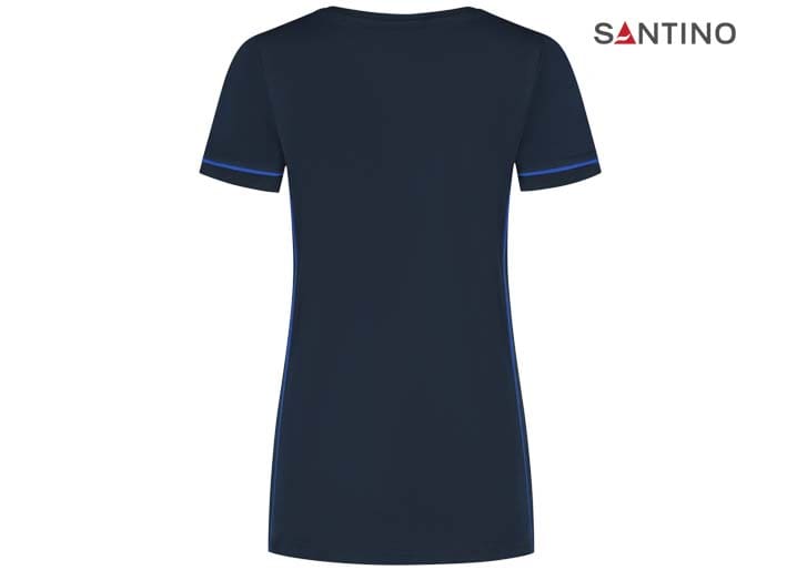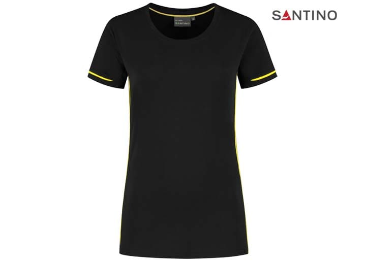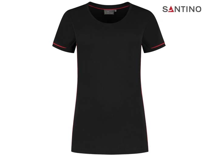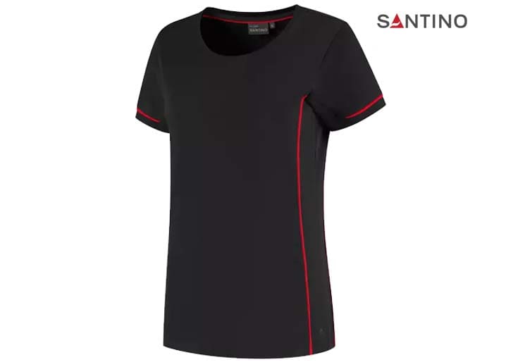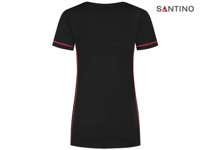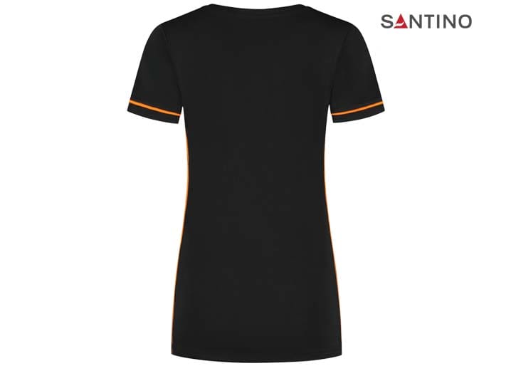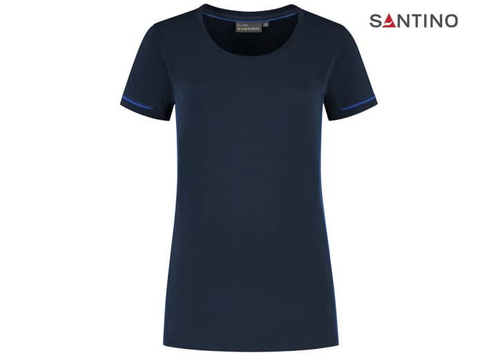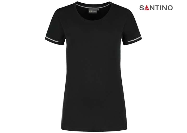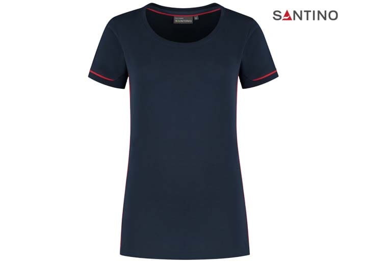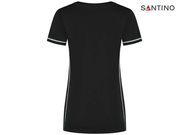 T-shirt, 80% organisch katoen / 20% gerecycled polyester, GOTS gecertificeerd, 180 gr/m2, single jersey, ladies fit, contrast piping, ronde hals en mouw met 1×1 ribboord. 3D Santino logo transfer op onderzijde.